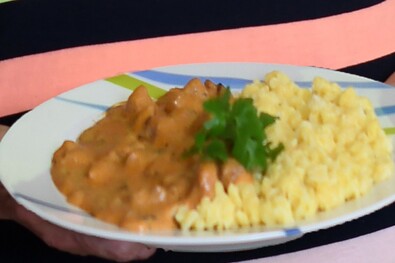Elkészítése. A húst és a szalonnát kockára vágjuk. A hagymát összeaprítjuk és kevés olajon a hússal együtt megpirítjuk. Hozzáadjuk a szalonnát is, és tovább pirítjuk, ha szükséges, kicsi vízzel felöntjük, hogy jobban puhuljon. Közben megszórjuk borssal, és ízlés szerint a többi fűszerrel, majd megsózzuk. Ha megpuhult a hús, hozzáadjuk a felkockázott gombát, vizet is adhatunk még hozzá, hogy legyen szaftja. A gombával együtt még 15 percig főzzük. Ha már majdnem kész, behabarjuk tejfölös liszttel. Egy bögre lisztből, két tojásból, kevés vízzel, sóval galuskát készítünk, és ezzel tálaljuk.