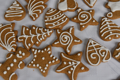 Hozzávalók: 25 dkg méz, 25 dkg margarin, 1 kg liszt, 30–40 dkg porcukor, 1 citrom héja, 4 egész tojás, 2 púpozott kiskanál szódabikarbóna, 1 csomag mézeskalács-fűszerkeverék; a díszítéshez: 1 tojásfehérje, 15 dkg porcukor, 2–3 csepp citromlé.