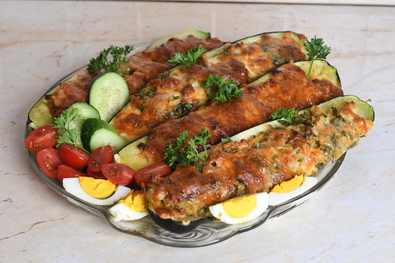 Elkészítés: A cukkinit megmossuk, kettévágjuk, a belsejét kivájjuk. Forró olajban megdinszteljük az apróra vágott hagymát, fokhagymát. Beletesszük a húst, sózzuk, borsozzuk, hozzáadjuk a sűrített paradicsomot és kevés vízzel 2 percig pároljuk, majd hozzáadjuk az előfőzött bulgurt is. A kivájt cukkiniket sütőpapírral bélelt tepsibe rakjuk, belekanalazzuk a tölteléket. A húsos rétegre paradicsomot karikázunk, megszórjuk reszelt sajttal és aprított petrezselyemmel. Előmelegített sütőben 20–25 percig sütjük.