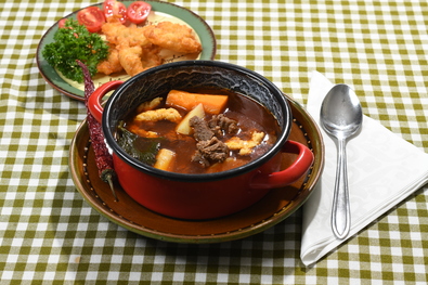 Hozzávaló: 60 dkg marhalábszár kicsontozva, felkockázva, 5 db krumpli, 5 db sárgarépa, 5 db petrezselyem és a zöldje, fél zeller és a zöldje, 3 fej hagyma, 2 gerezd fokhagyma, 2 db paradicsom, 2 db paprika, bors, pirospaprika, köménymag, só; a galuskához: 6 dkg liszt, 2 tojás, 4 dkg mangalicazsír; a recsegéhez: reszelt nyers krumpli, liszt, só, forró olajban kisütve.