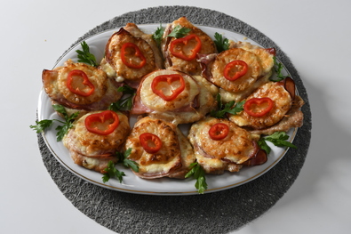 Hozzávalók: egy doboz körszeletes ananászbefőtt (kb. 8 szelet), 10 dkg reszelt sajt, 8 db sajtszelet, 8 szelet kicsontozott sertésszelet (hosszúkaraj), 20 dkg gépsonkaszelet, 2 ek. liszt, 1 ek. vaj/margarin, só, bors, 3 ek. olaj, díszítéshez paprikakarikák és 2–3 szál petrezselyemlevél.