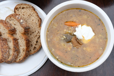 Hozzávalók: 1 bögre hajdina, 10 dkg szárított vargányagomba beáztatva, 2 fej hagyma, 2–3 szál sárgarépa és petrezselyem, 2 zeller levéllel, 3 db krumpli, 1 kelkáposztalevél, babérlevél, tárkony, petrezselyemlevél, lestyán, pirospaprika, só.
