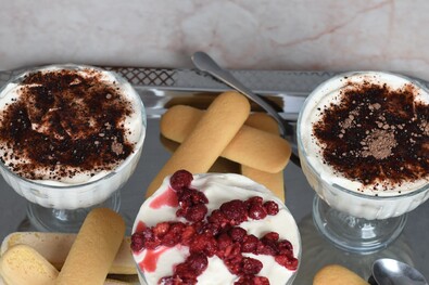 Elkészítése. A tojásokat elkeverjük a porcukorral, majd hozzáadjuk a mascarponét. A tejszínt kemény habbá verjük, és az egészet összedolgozzuk. Kb. fél liter kávét főzünk, hozzáadjuk a rumaromát. A hozzávalókat belerétegezzük a kelyhekbe: a babapiskótát belemártjuk a kávéba (gyorsan kell forgatni, hogy ne ázzon el!), ez kerül alulra a krémmel vékonyan kikent kehelybe, majd a krém, újra piskóta, újra krém. A tetejét kakaóporral díszítjük. Az epres változathoz a tejet és a krémlevesport összekeverjük. A piskótát az epres krémbe mártjuk, rétegezve helyezzük a kehelybe: krém, áztatott piskóta, krém, eper. Az epret érdemes több rétegben elosztani.
