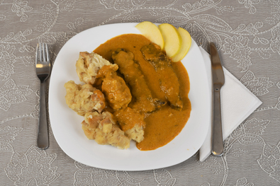 Hozzávalók: 1,5 kg marhahússzelet (comb, nyak, hátszín), 5 db zsemle felkockázva, 5 db tojás, 2 ek. mustár, 1 közepes vöröshagyma, 1 fej fokhagyma, 1 kg leveszöldség (sárgarépa, zeller, petrezselyemgyökér), 1 kg liszt, 1 dl fehérbor, 5 dl tejföl, 1 ek. sűrített paradicsom, 1 dl olaj, 1 dl tej, fűszerek: só, bors, szegfűbors, babérlevél, őrölt kömény, borókabogyó, pirosarany, gulyáskrém, 1 ágacska kakukkfű, 3 ek. cukor.