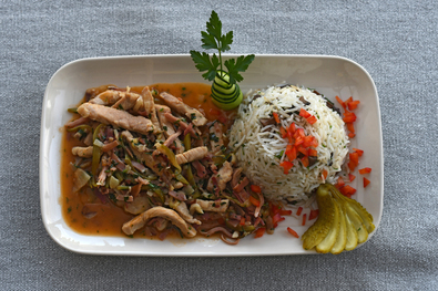 Zománcos lábasban kevés kacsazsíron megpirítjuk a rizst. Vizet forralunk, és hozzáöntünk másfélszer annyi vizet, majd megsózzuk. Hozzáadunk egy félbevágott paprikát és egy félbevágott vöröshagymát. 180 Celsius-fokos sütőbe tesszük és lefedve 20 percig sütjük. 20 perc után levesszük a fedőt, kivesszük a zöldségeket, átkeverjük és fedő nélkül hagyjuk kigőzölni. A kész rizsbe belekeverjük az apróra vágott petrezselyemlevelet és beletesszük a pirított gombát. Összekeverjük és tálalásig pihentetjük.