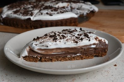 Hozzávalók: Morzsaalap: 300 g zabkeksz, 100 g vaj, 3 evőkanál barna cukor, 1 teáskanál só, 2 teáskanál fahéj. Csokikrém: 420 g tej, 150 g tejszín, 30 g kukoricakeményítő, 150 g cukor, 15 g holland kakaópor, 3 nagy tojás, 100 g étcsokoládé, csipet só. Habdíszítés: 400 g habtejszín, fél vaníliarúd vagy 1 teáskanál 30 százalékos vaníliakivonat, 1 evőkanál porcukor, 1 csipet só, étcsokoládé-reszelék.