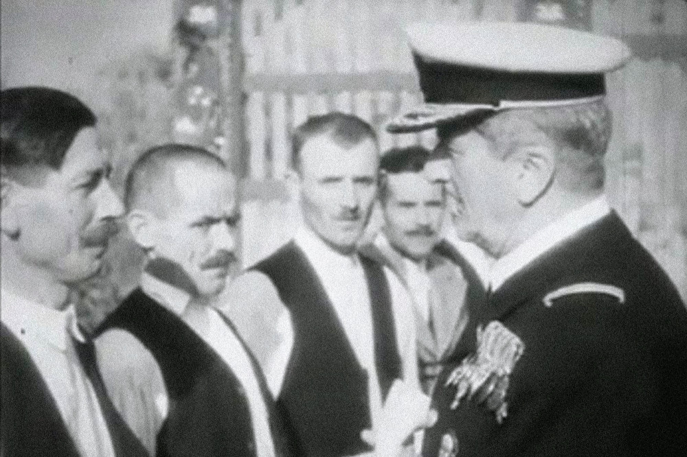 Horthy Miklós köszönti az erdővidéki kapuállítókat. A felvétel korabeli filmhíradóból származik. Képfeldolgozás: Vargyasi Levente