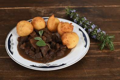Hozzávalók – a raguhoz: 1,2 kg szarvascomb vagy -lapocka, 3 nagy fej vöröshagyma, 50 dkg erdei gombakeverék (rókagomba, vargánya, laskagomba, barna csiperke), 3–4 evÅ‘kanál áfonyalekvár, 2 dl vörösbor, só, bors, 4–5 db babérlevél, 2–3 ág friss kakukkÂfű; a burgoÂnyafánkhoz: 1 kg burgonya, 40 dkg liszt, 2 dkg élesztÅ‘, 2 db tojás, 1 teáskanál só, kisütéshez olaj vagy zsÃr.