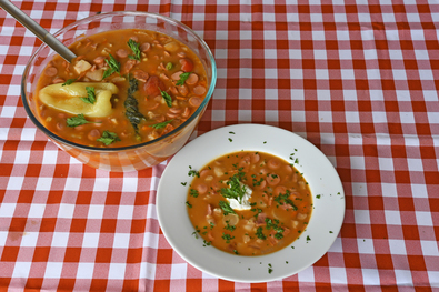 Elkészítése. A babot előző este hideg vízbe áztatjuk. A csülköt kicsontozzuk, 15–20 percre beáztatjuk, megtisztítjuk, majd bő vízben feltesszük főni. Ízesítjük 3 db félbevágott hagymával, 8 gerezd félbevágott fokhagymával, 10–15 szem egész borssal és 2 babérlevéllel. Forrástól számított 20 perc után levesszük a tűzről (félközépig főzve), a csülköt kivesszük, a levét átszűrjük. A tiszta lébe beletesszük a beáztatott babot, hozzáteszünk 2 hagymát egyben, 4 gerezd fokhagymát, 15 szem egész borsot és 25-30 percig főzzük. A csülökről leszedjük a bőrt, kis kockákra vágjuk és hozzátesszük a babhoz főni. Közben a félig megfőtt csülökhúst apró kockákra vágjuk; ezt is hozzátesszük a leveshez. Megtisztítjuk a zöldségeket, egyforma karikára vagy kockára vágjuk – ízlés szerint, és ezeket is hozzátesszük a leveshez. 2 tojásból elkészítjük a csipetkét. A zeller zöldjét megmossuk, csokorba kötjük és beletesszük a levesbe. 10 perc után pedig beleszaggatjuk a csipetkét. Hozzáadjuk a paprikát, paradicsomot, megsózzuk és lefedve főzzük közepes lángon. 2 evőkanál zsírral rántást készítünk: aranybarnára pirítjuk a lisztet, egy evőkanál pirospaprikát adunk hozzá, a bableveslével felhígítjuk a rántást, felforraljuk és beleöntjük a levesbe. 5–10 percig forraljuk, utóízesítjük, majd tejföllel tálaljuk.