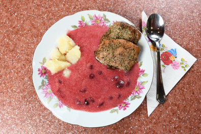 Hozzávalók: 1 kg fagyasztott meggy, 2 tasak puncsízű pudingpor (főzős), 500 ml habtejszín, 1 evőkanál fahéj, 4–5 evőkanál cukor, 6 szelet tarja, 2 gerezd fokhagyma, 2 fej hagyma, 2 dl olaj, só, bors, zöldfűszerek ízlés szerint.