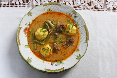 Hozzávalók: 80 dkg ürühús (nyak), 2 fej hagyma, 2 paradicsom, 40 dkg zöldbab, 2 paprika, 2 gerezd fokhagyma, 2 evőkanál sertészsír, 3 db sárgarépa, 3 db petrezselyem a levelével, só, bors, tárkony, fűszerpaprika, őrölt kömény, babérlevél, fél citrom leve. A gombóchoz: 50 dkg „öreg” burgonya, 1 db tojás, 1 evőkanál zsír, 2 evőkanál liszt, só. A habaráshoz: 1 dl tejföl, 2 evőkanál liszt