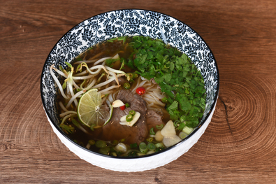 Hozzávalók: 5–6 db marhacsont, 300–400 g hátszín vagy marhaszegy, 2–3 nagyobb darab gyömbér, 2–3 fej fokhagyma, 1 marék egész fekete bors, 1 teáskanál egész kömény, 1 teáskanál borókabogyó, 1 dl halszósz (elhagyható), 1 dl 10%-os ecet, 1 dl szójaszósz, 4 db hagyma, 6 db fahéjrúd, só, ételízesítő (elhagyható); a tálaláshoz: 1 csomag rizstészta, 2–3 db nyers piros csili, 1 csomag babcsíra, 1 db lime, 5–6 szál újhagyma, 1 csokor friss koriander (vagy lestyán, de a petrezselyem is tökéletes egy kis mentával), 4–5 gerezd fokhagyma.