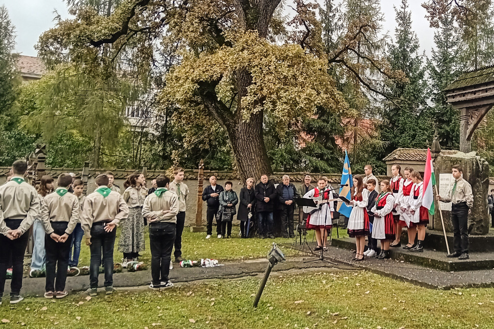 A kovásznai belvárosi református templom kertjében, az 1848–49-es forradalom és szabadságharc emlékművénél számos helybéli hajtott főt a 13 aradi vértanú emléke előtt az RMDSZ városi szervezete által szervezett megemlékezésen tegnap délben, szomorkás időben.