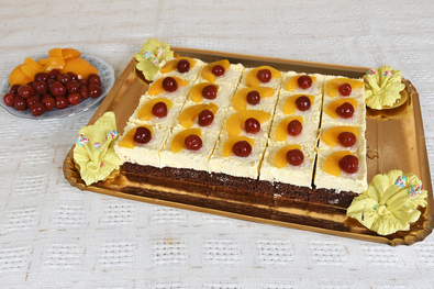 Hozzávalók: a piskótához: 3 tojás, 60 g cukor, 10 g vaníliás cukor, 80 g liszt, 10 g kakaó (20–22%-os), 1 mokkáskanál szódabikarbóna, 1 evőkanál olaj; a túrókrémhez: 250 g margarin vagy vaj, 250 g porcukor, 300 g túró, 20 g vaníliás cukor, fél citrom héja lereszelve, 100 g tejszínhab; a zselatinhoz: 100 g víz, 10 g zselatin, 30 g cukor; a díszítéshez: őszibarackbefőtt, cseresznyebefőtt.