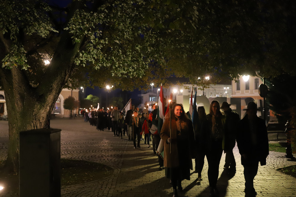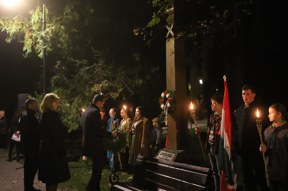 A műsor végén némán megkoszorúzták a sötétben megvilágított ’56-os emlékművet, talán több koszorú került annak talapzatára, mint az elmúlt években. Ezután fáklyás felvonulás következett az Erzsébet parkba, ahol a kommunista diktatúra áldozatainak emlékművénél is koszorúztak. Ott Takó István római katolikus plébános mondott imát, közreműködött a Pro Musica Kamarakórus Sipos Zoltán vezetésével.