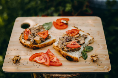 Elkészítése. A hiripgombát megpucoljuk, kockára vágjuk, az olívaolajon megpároljuk, hozzáadjuk a tört dióbelet, és együtt pároljuk. Sózzuk, borsozzuk, megszórjuk kakukkfűvel, majd időnként kevés kávét öntve alá addig pároljuk, míg a gomba krémes állagú lesz. Ekkor kevés balzsamecettel ízesítjük, majd még melegen, pirítós kenyéren, friss zöldséggel tálaljuk.