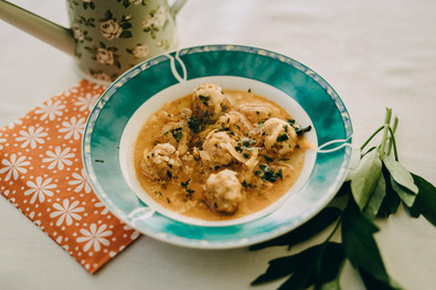 Hozzávalók: 2 murok (sárgarépa), 1 paprika, 1 kis karalábé, ½ hagyma, 2 nagy paradicsom, 1 nagy szelet zeller, só, ételízesítő, lestyán, citromsó (citromlé), 2–3 evőkanál olaj; illetve a gombóchoz: 50 dkg darált hús (sertés és növendék marha, vegyesen), 5 dkg rizs, 1 tojás, só, bors, pirospaprika.