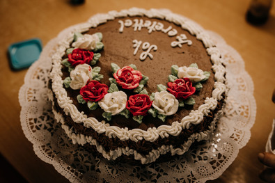 A színes krémekből rózsaszín és fehér rózsákat, illetve zöld leveleket készítünk. A bevont torta oldalát tetszés szerint díszítjük, a tetején pedig elhelyezzük a rózsákat.
