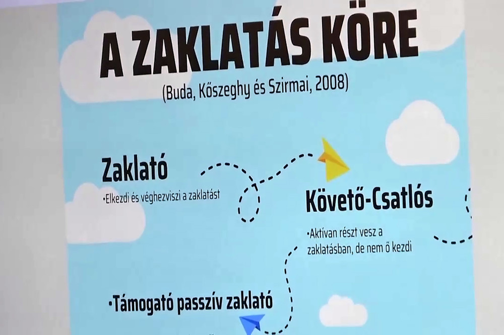Mindenki benne van valamiképpen a zaklatásban – hangsúlyozta az előadó, aki bemutatta a zaklatás körét is. „Akiről a legtöbbet szoktunk beszélni, az a zaklató, ő van előtérben. Mögötte ott van az, akit a magyar nyelv nyújtotta lehetőség miatt csatlósnak is nevezhetünk, ő a követő, aki tartja az ajtót, amíg a másik elcsen dolgokat, tehát aktívan részt vesz a folyamatban. Az osztályban mindig van egy nagy csoport, akiket támogató vagy passzív zaklatóknak nevezünk, akik, ha felmerül egy név, akkor dobják rá a lájkokat, nekik tulajdonképpen tetszik. Nem ők csinálják, de nevetnek a dolgon. Van egy érdekes szereplő, aki, ha azt látja, hogy az osztályban presztízst lehet szerezni mémek gyártásával más kárára, ő meglátja ebben a fantáziát, főleg, ha semmi mással nem tud kitűnni sem a tanároknál sem a társai szemében. Így ő is potenciális zaklatóvá válhat. A másik nagy csoport a tétlen szemlélőké, ebből nagyon sok van” – vázolta a „hierarchiát”.