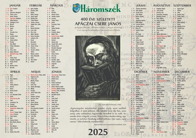 A naptársorozat 2025-ös kiadása kultúrtörténetünk egyik legismertebb személyiségének állít emléket. Apáczai Csere János, ahogy előneve is jelzi, a Háromszék és Barcaság találkozásánál fekvő településen született négy évszázaddal ezelőtt, és széleskörű, máig ható munkásságát alig lehet címszavakban megfogalmazni. Hiszen jelentős a pedagógiai tevékenysége, alkotott filozófusként és kálvinista teológusként, a magyar nevelésügy és az anyanyelvi tudományos ismeretterjesztés előfutára volt, s amiről leginkább ismert: az első magyar enciklopédista, a karteziánus ismeretelmélet korai magyar követőinek egyike.