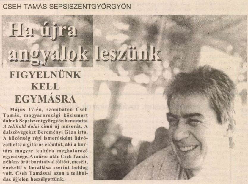 Most múltba, álmokba, fiatalságba visszaröpítő élmény volt megtalálni és újraolvasni „azon a teliholdas éjjelen” a Cseh Tamással készített beszélgetést (Ha újra angyalok leszünk, Háromszék, 1997. május 27.). Általában tartózkodom ettől a műfajtól, ám most minden rögzített szavának örülök, s azokat nem csupán időszerűnek, hanem fontosnak és dokumentumértékűnek tartom, ezért az alábbiakban felidézek néhány akkori kérdést, illetve az azokra adott választ. Noha egy letűnt korhoz kapcsolódnak, miként dalai, Cseh Tamás Sepsiszentgyörgyön rögzített gondolatai mégis kortalanok, örök érvényűek. Megőrzendőek.