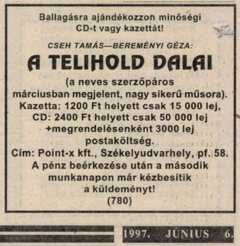 Hirdetés a Háromszék 1997. június 6-i számában – ma már elképzelhetetlen így ilyen reklám egy napilapban