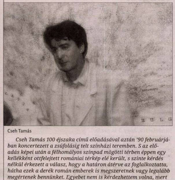 Pontosabban és személyesebben fogalmazva: kisebbfajta csodának tekinthető. Némiképp furcsa és ma már nehezen kideríthető módon az akkori Háromszék minderről nem cikkezett, s maga Sylvester is csupán 2009-ben, Cseh Tamás halálát követően, búcsúztató soraiban idézte fel az akkor történteket. Emellett Albert Levente fotóriporter kollégánk – aki fényképezőgépével is végigkísérte 1990-ben Cseh Tamásékat – Mesélő képek sorozatában utalt röviden akkori emlékeire (Golyónyomok, golyónyomok című írás és fotók, Háromszék, 2020. december 24.). „Cseh Tamás 100 éjszaka című előadásával aztán ’90 februárjában koncertezett – írja Albert Levente – a zsúfolásig telt színházi teremben. S az előadás képei után a félhomályos színpad mögötti térben éppen egy kellékként ottfelejtett romániai térkép elé került, s szinte kérdés nélkül érkezett a válasz, hogy a határon átérve az foglalkoztatta, hátha ezek a derék román emberek is megszeretnek vagy legalább megértenek bennünket. Egyebet nem is kérdezhettem volna, mert a következő percekben rajongók tömege özönlött minden irányból.”