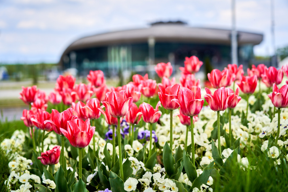 A Sepsi OSK Aréna előtti körforgalomban például a tulipánok, boglárkák mind-mind piros-fehér színben nyílnak, elvirágzásuk után ezeket piros-fehér begóniák váltják.