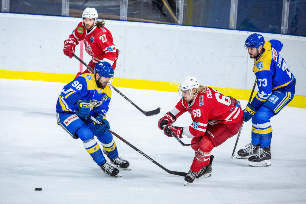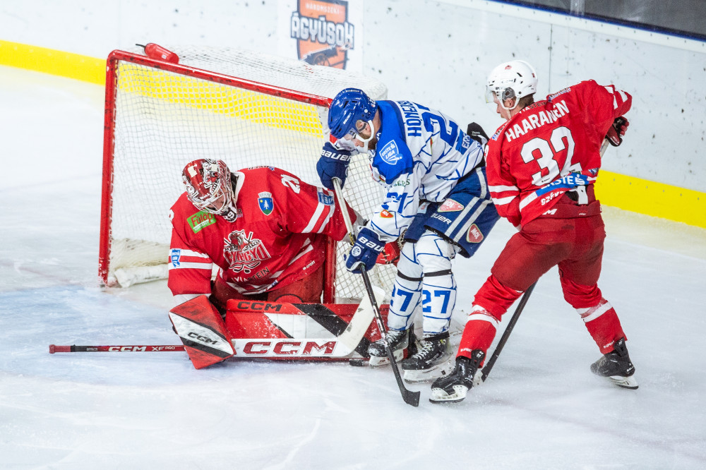 Az első elődöntő első harmadában a gyergyószentmiklósi csapat akarata érvényesült, amely a 10. percben a vezetést is megszerezte (1–0). A piros-fehér mezesek a szünet előtt növelték előnyüket, a 19. percben Janne Väyrynen góllal segítette együttesét (2–0). A második játékrészben magasabb fokozatba kapcsolt a csíkszeredai alakulat, ezáltal a 27. percben Becze Tihamér révén szépített (2–1). A folytatásban is Kevin Constantine legénysége játszott összeszedettebben, így a 36. percben emberelőnyben egyenlített (2–2). A küzdelmes utolsó felvonásban mindkét kapu előtt több lehetőség adódott, ellenben újabb találat nem született, ezáltal következhetett a hosszabbítás, amelynek 9. percében Matias Haaranen eldöntőtte a mérkőzést (3–2).
