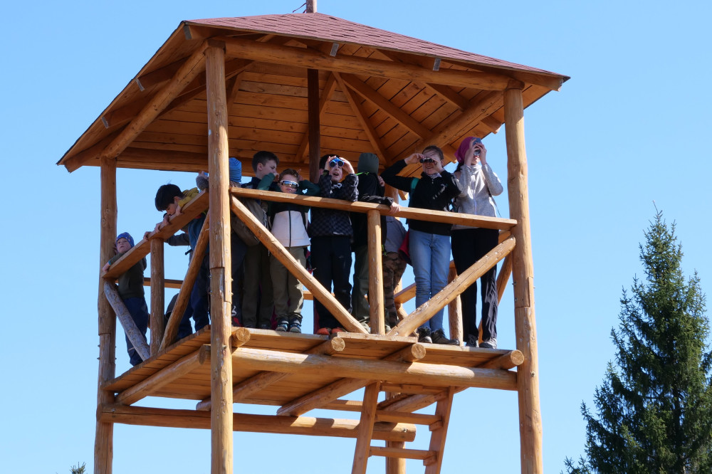 Gyermekek nézik a tájat a fából épített kilátóból