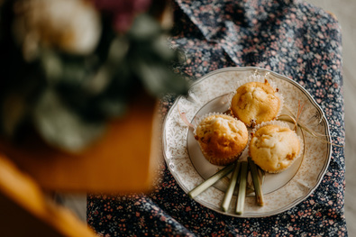 A muffinforma üregeit kirakjuk kapszlikkal, mindegyik aljába teszünk egy kiskanálnyi rebarbara-alma keveréket, majd 1–2 evőkanálnyi kavart tésztát töltünk bele, illetve a tetejét is megszórjuk gyümölcskeverékkel. Az így előkészített muffinokat 180 Celsius-fokra hevített sütőben 15–20 perc alatt megsütjük.