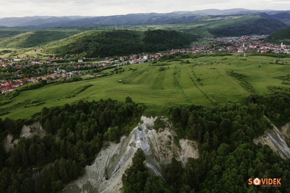 Felszíni sóképződmények Parajd térségében, háttérben a település. Fotó: Facebook / Sóvidék Televízió