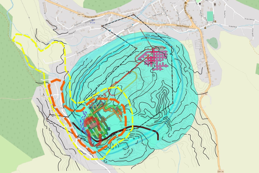 A parajdi sóbánya vörös, narancs és sárga színnel jelzett kockázati övezetei, ahogy Kovács J. Szilamér megrajzolta. A térképen látható a bánya településhez viszonyított elhelyezkedése is. A geológus azt is megjegyzi, „az út túloldala egy mikroregionális vető levetett tömbjére esik, ott a só már 1km mélyen van, itt oldódási veszéllyel nem kell számolni, csupán utólagos helykitöltő csuszamlásokra lehet számítani”. Kép: Facebook / Kovács J. Szilamér