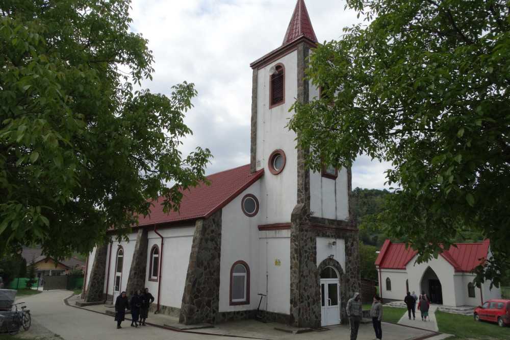 A reggel nyolc órás miséről kijövő hívekkel a templom udvarán találkozunk, köszöntjük őket, én adjon Istennel, Liliana, na, hogy van kend? Halott van a faluban, sokan a templom melletti ravatalozó felé veszik útjukat. Már távozna is szolgálata után Antonică Petru plébános, de megszólítjuk, s mondjuk, mi járatban vagyunk. Szívélyesen visszatér velünk a Szűz Mária születése tiszteletére felszentelt templomba. A Magyar Katolikus Lexikon szerint az első, Szent István magyar király tiszteletére felszentelt magyarfalusi templom már állt a 19. század elején, 1910–1914 között új templomot építettek, védőszentje István vértanú volt. Első moldvai útja (1929) alkalmával Domokos Pál Péter még látta a sekrestyébe dugott régi oltárképet. 1960-ban a templomot Szűz Mária születése tiszteltére szentelték. Az 1977-es földrengéskor a templom megrongálódott, 1980-ban építették újjá – olvasható a Magyar Katolikus Lexikonban. Szintén itt jegyzik meg, hogy az 1945-ben Egyházaskozárra települt csángók évtizedeken át imaházban gyakorolták vallásukat, csak 1996-ban szentelhették fel saját templomukat ugyancsak Szent István magyar király tiszteletére.
