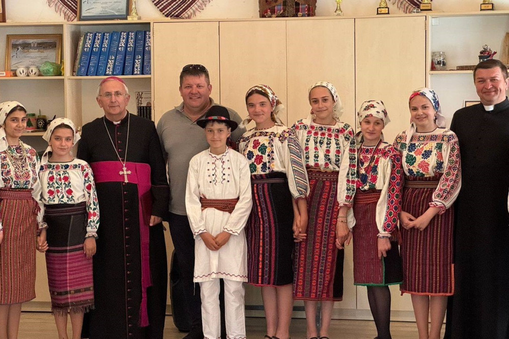 Iosif Păuleț jászvásári püspök a magyar házban helyi gyermekekkel, Polgár Lászlóval, a Moldvai Csángómagyarok Szövetsége elnökével és Antonică Petru magyarfalusi plébánossal. Fotó: Facebook / Antonică Petru