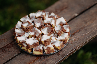 Elkészítése. A pudinghoz a vaníliás pudingport és a cukrot simára keverjük 1–2 deci tejjel. A maradék tejet felforraljuk, majd folyamatosan kavarva belecsorgatjuk a pudingporos keveréket, és sűrű pépet főzünk belőle. Az így nyert pépet többször megkavarva kihűtjük és felhasználásig félretesszük. A barna piskótához keverőtálba mérjük a cukrot, összekeverjük a tojással, majd kanalanként belekeverjük az olajat, aztán felváltva a lisztet és a tejet. Végül belekeverjük a szódaport és a kakaót. Az így nyert kavart tésztát sütőpapírral bélelt tepsibe simítjuk, majd kiskanállal sorban egymás mellé halmokat rakunk bele a kihűlt pudingból. A tepsit 200 Celsius-fokra melegített lerbe (sütőbe) toljuk és kb. 20–30 perc alatt megsütjük. Ezalatt a tejfölt összekavarjuk a vaníliás cukorral, majd a már kisült, de még mindig forró sütemény tetején egyenletesen elkenjük. A finom süteményt kockára vágva tálaljuk.