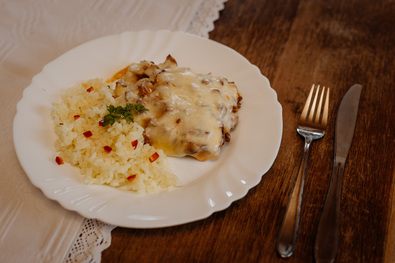 Az így előkészített tepsit 15 percre 170 Celsius-fokra hevített sütőbe tesszük. Tálaláskor egy szelet húst mártással együtt tányérra emelünk a tepsiből, melléje párolt rizst halmozunk és savanyú uborkát kínálunk hozzá. A recept elkészíthető csirkemellből vagy borjúbélszínből is. Télen használhatunk fagyasztott gombát is. Ebben az esetben azonban figyeljünk oda arra, hogy a gomba fagyottan kerüljön a dinsztelt hagymára, mert így nem lesz rágós.