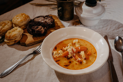 Tálaláskor kivesszük a gömböcöt a fazékból, felszeleteljük, majd másodikként tesszük az asztalra. A levest első fogásként friss kenyérrel fogyasztjuk.