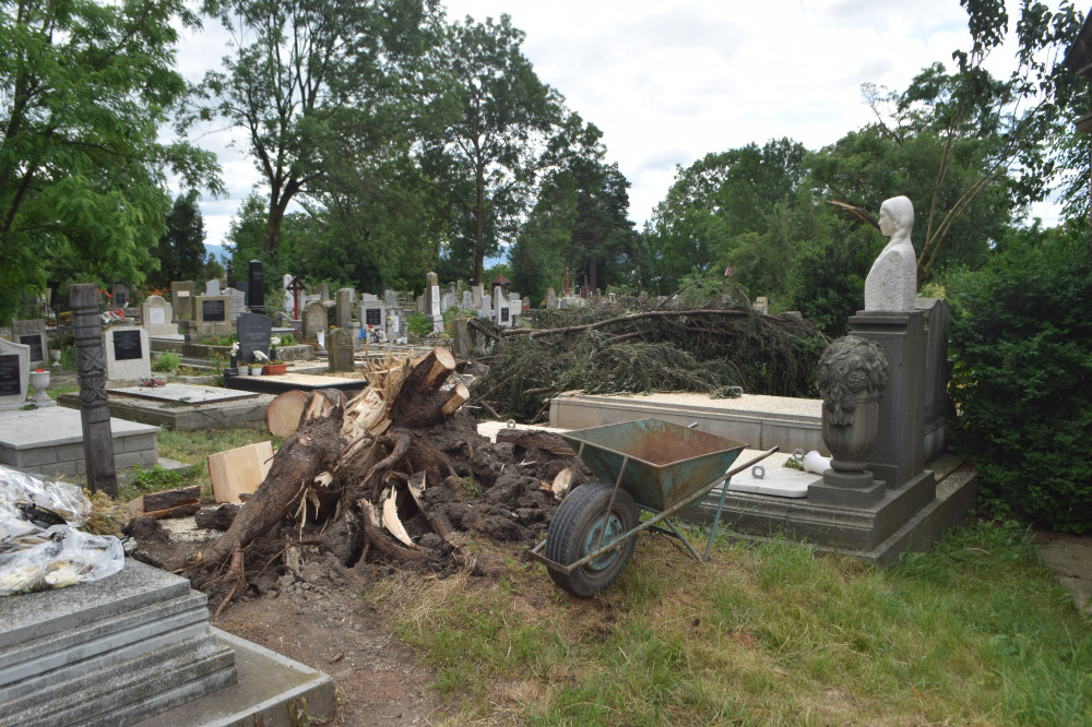 Beder Imre parókus lelkipásztor felhívására szombaton is zajlott a munka, az önkéntesek java része nő volt, akik főleg az ágak elhordásában segédkeztek. A tiszteletes érdeklődésünkre elmondta: még korai lenne pontos felmérésről beszélni, de a kár nagyon nagy. Három-négy fát a közeljövőben még ki fognak vágatni, többek között a kétfelé hasadt akácfát és a Purcell-kripta közelében lévő hatalmas fát, amit a vihar megcsonkított. A ravatalozó mögött balra szintén ki kell vágni a kettéhasadt fát, amelyiken még két ág maradt, mert az is veszély jelent a temetőt látogatók számára. Az öreg, veszélyes fák kivágását másfél éve már elkezdték, tíz le is volt bélyegezve, és a vihar előtt kettőt ki is vágtak, a többi sorsát eldöntötte a vihar. A magas fákat vissza fogják vágni. Öt és tíz közötti azon sírkövek száma, amelyeket ledöntött az ítéletidő, több sírhely borítólapján okozott kisebb-nagyobb kárt, 30-40 lehet azon sírkövek száma, amelyeket csak ledöntött, de más kárt nem okozott azokban, ezért könnyen vissza lehet állítani őket.