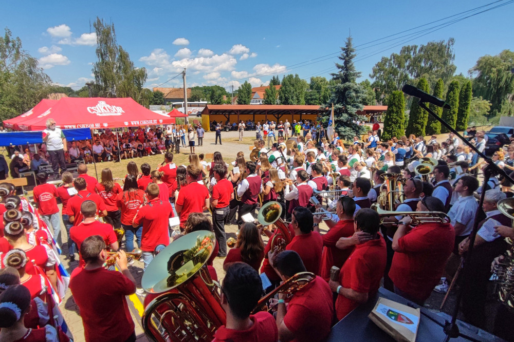A zenekarok közösen fújják a Fehérvári indulót Mihály Béla szentesi karnagy vezényletére