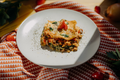 Az elkészült lasagnét 20 perc pihentetés után nagy kockákra vágva tálaljuk.
