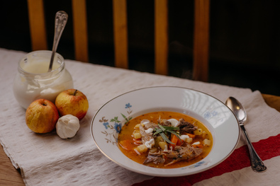 Ugyancsak ezalatt a zsíron vékony rántást készítünk a lisztből és pirospaprikából, majd sűrítjük a levest. A legvégén beletesszük a levesbe a finomra aprított ecetes tárkonyt, ha szükséges, még sózzuk, és felforraljuk. Forrón, barna kenyérrel tálaljuk, az asztalra tárkonyecetet és tejfölt teszünk, hogy mindenki még ízesíthesse.