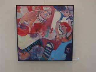 Tomos Tünde a nő létezésének határtereit ábrázolja. A fenti szakrális világának babaarcú angyala és a lent várakozó maszkulin világ között jelöli ki helyét. A kettő között fenntartó erő az állati figurákkal jelképezett tiszta ösztön. A kubista hasonlóságot mutató és szürreális képélmény a világszintek közti egyensúlyozás játszmájára utal. Németh Katalin ikonja szintén az angyalok transzcendens létezésének hitébe helyezi történelmi múltunkat.