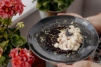 A különleges ízesítésű csirkefalatkákat párolt fekete rizzsel tálaljuk.