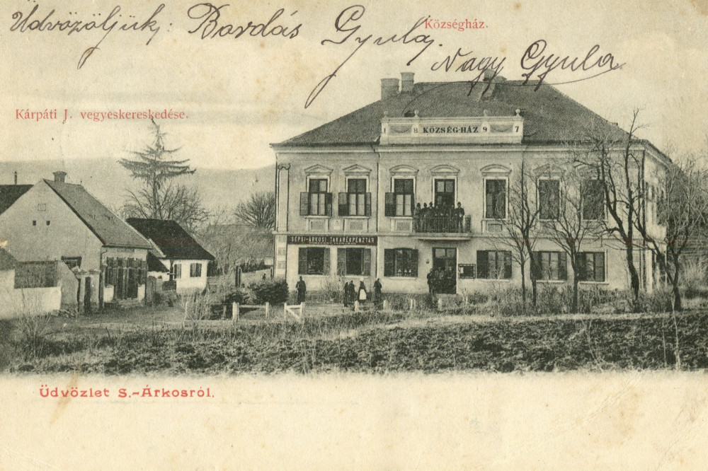 Az árkosi községház a 20. század elején – az árkosi fogyasztási szövetkezet által kiadott képeslap. Fotó: Nyáguly Imre-Mátyás gyűjteménye