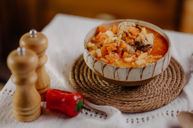 Közben a rántáshoz a lisztet a zsíron folyamatosan kavargatva zsemleszínűre pirítjuk, megszórjuk paprikával, összekeverjük, majd azonnal feltöltjük egy csésze hideg vízzel, és kiforraljuk. Az így nyert rántással berántjuk a levest. A végén felverjük a tojást, és folytonosan kavargatva a levesbe csorgatjuk. Tálalás előtt citromlével ízesítjük, és megszórjuk finomra vágott petrezselyemzölddel, zellerlevéllel.