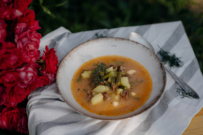 Elkészítése. Hamarabb elkészítjük az alaplevet. Ehhez hideg vízben főni tesszük a combcsontot, a nyakat és a farkat. Ha felforrt, beletesszük a megpucolt, kettéhasított murkot és petrezselymet, a szelet zellert és az egészben hagyott hagymát, sózzuk, majd lassú tűzön addig főzzük, amíg minden megpuhul. Ha az alaplé megfőtt, leszűrjük, és felhasználásig hűtőben tároljuk. A kicsontolt combhúsból előbb pörköltet készítünk. Ehhez a hagymát kockára vágjuk, a zsíron üvegesre dinszteljük, megszórjuk pirospaprikával, beletesszük a kockára vágott juhhúst, majd addig kavargatjuk, míg kifehéredik. Ekkor sózzuk és lehetőleg a saját levében puhára pároljuk. Ezalatt megpucoljuk a zöldségeket, a paprikaféléket apró, a pityókát nagy kockára vágjuk, a zöldpaszulyt 2–3 centis darabokra tördeljük. A már kész pörköltalaphoz előbb hozzáadjuk a paprikát, majd a zöldpaszulyt, rövid ideig együtt pároljuk a hússal, majd feltöltjük forró alaplével, és tovább forraljuk. Ha már a zöldpaszuly is puha, beletesszük a krumplit, majd addig főzzük, amíg az is megpuhul. Ezután a lisztet elkeverjük a tejföllel és kevés forró levessel, majd sűrítjük vele a levest. A végén beletesszük a finomra vágott zöld kaprot és még kevés pirospaprikát. Az ínyenc levest friss kenyérrel tálaljuk, az asztalra tejfölt teszünk, hogy aki még óhajtja, tehessen a tányérjába.