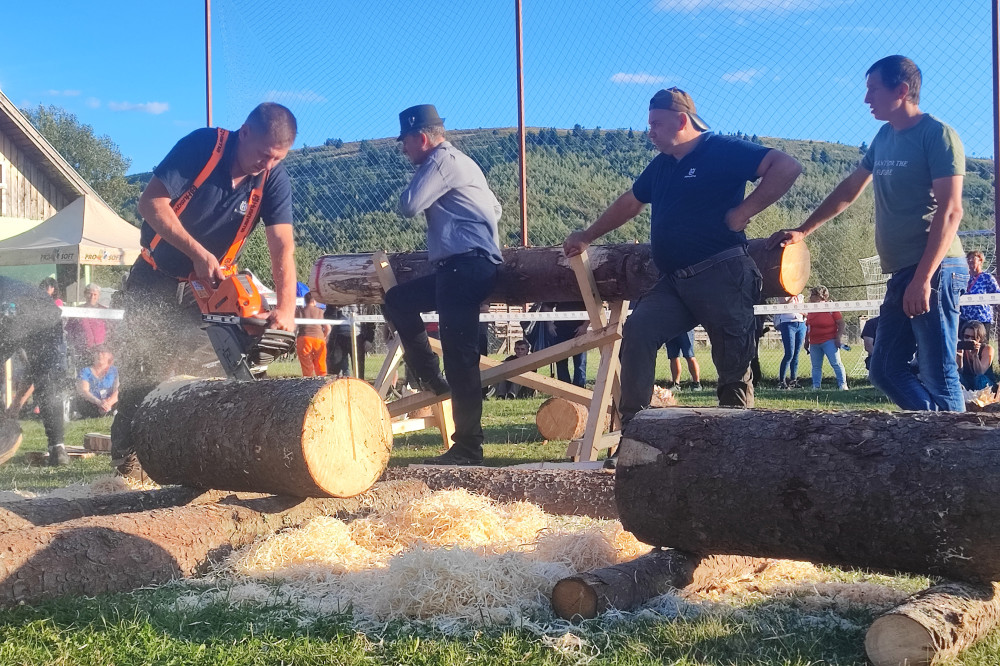 A futballpályán rendezett immár hagyományos favágó verseny hat próbából állt: a motorfűrész láncvezetőjének megfordítása, irányított döntés (a dőlő rönknek léggömböt kellett kipukkasztania), rönkvágás fejszével, két „karika” levágása motorfűrésszel, karika levágása kézifűrésszel, végül rönk hosszhasítása négy részre motorfűrésszel.