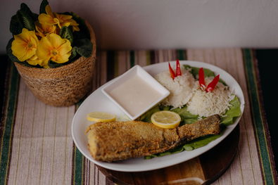Hozzávalók: 4 közepes farkassügér; a páchoz 1 kiskanál mustár, 1 kiskanál só, ½ kiskanál bors, ½ kiskanál kurkuma, 1 cikk fokhagyma, 4 evőkanál olaj; a panírozáshoz: 4 evőkanál finomliszt, 4 evőkanál kukoricaliszt (kukoricadara); a sütéshez: kb. 3 dl olaj; a fokhagymakrémhez: 3–4 cikk fokhagyma, 0,5 dl olaj, só, kevés cukor, ecet, 1–2 evőkanál tej, 3–4 evőkanál tejföl.