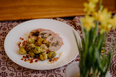 Hozzávalók: A gombával töltött bélszínhez: 1 disznóbélszín (szűzpecsenye), 50 dkg csiperkegomba, 1 evőkanál olaj, 3–4 vékony szelet prágai sonka, 15–20 dkg vékonyra szeletelt bacon, só, bors, fokhagymapor. A sajtos bimbós kelhez: 50 dkg bimbós kel, 15 dkg apróra vágott sonka, 1 tojássárgája, 1 dl főzőtejszín, 5 dkg parmezán, diónyi vaj.